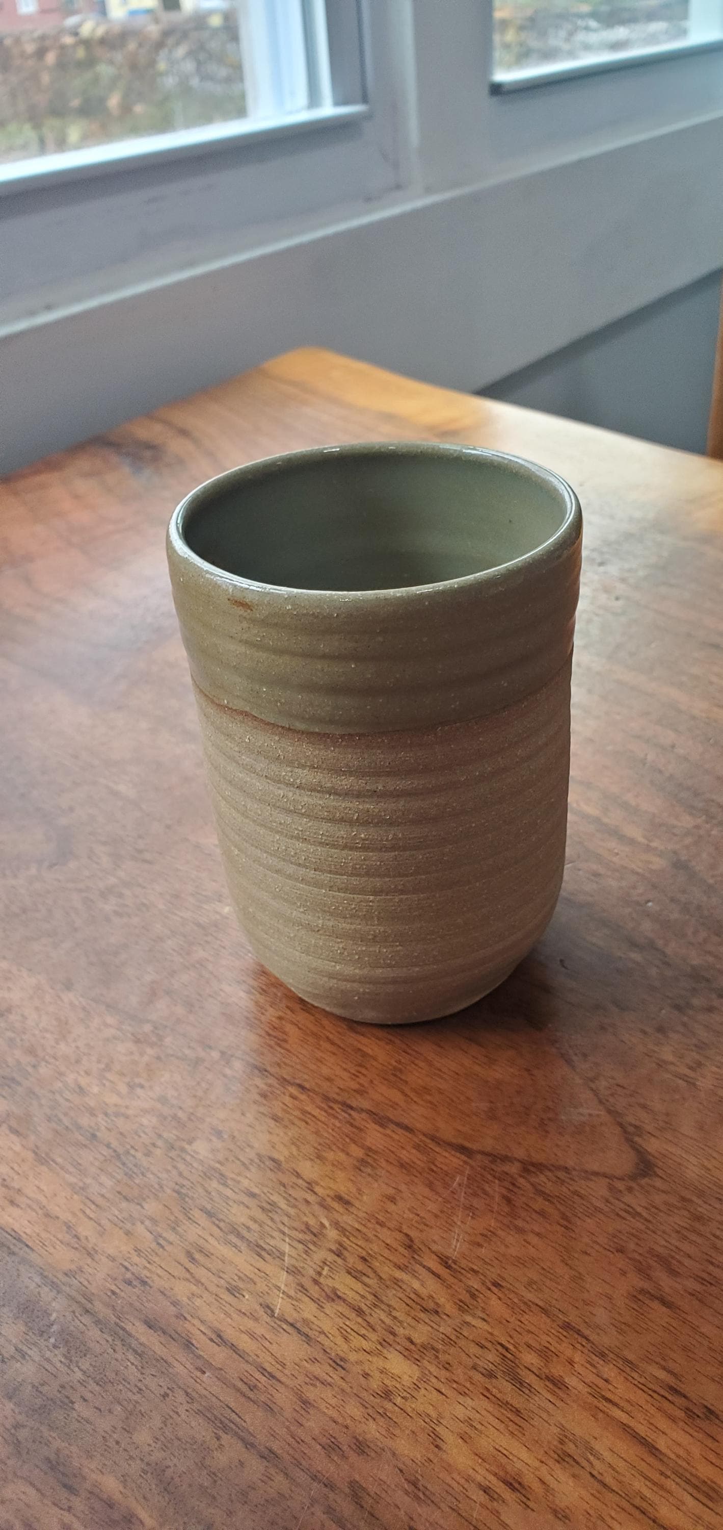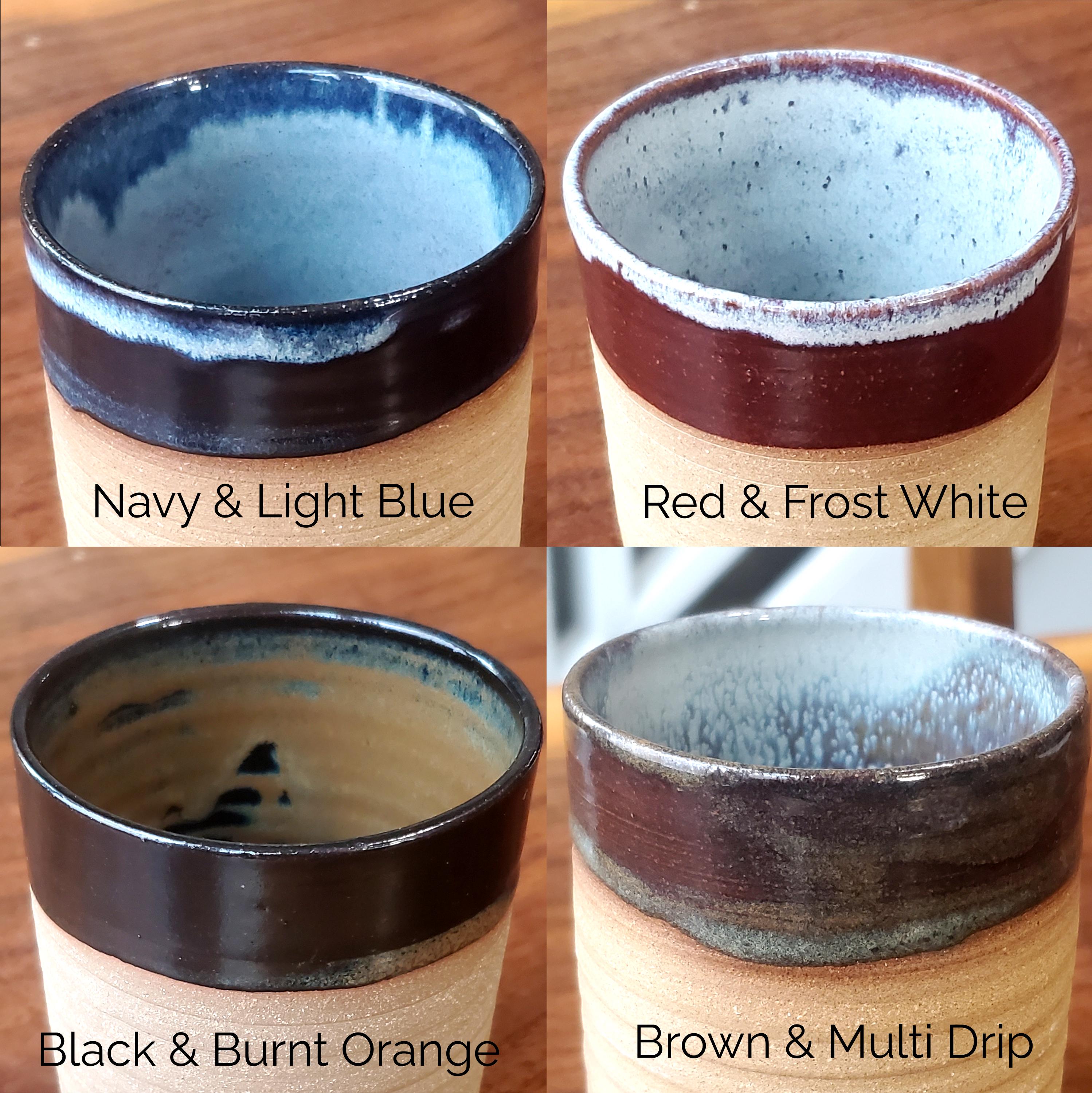 The exposed stoneware clay is a rich beige. The glazed part on the sample is a translucent light green that brings out the darker speckles in the clay. The inside of the mug and the rim are glazed. The other glaze colors currently available are also pictured. I would recommend ordering a sets in the same color, as the glaze colors have different sheen and pooling.