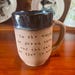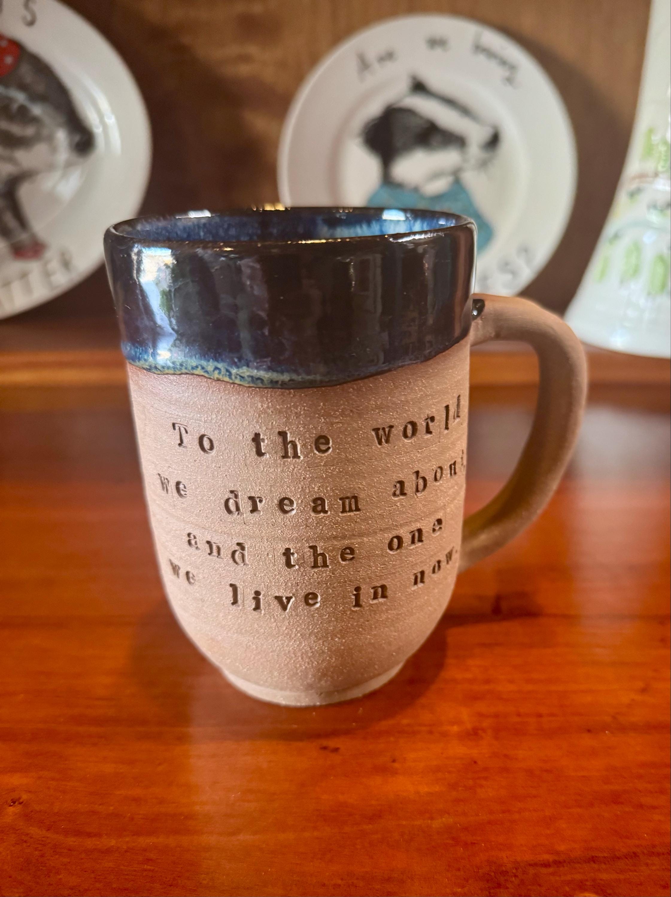 Your mug will be handmade on the ceramics wheel. Then, your quote is stamped into the clay and the handle is added. The last step is firing it in a kiln at over 2,000 degrees Fahrenheit.