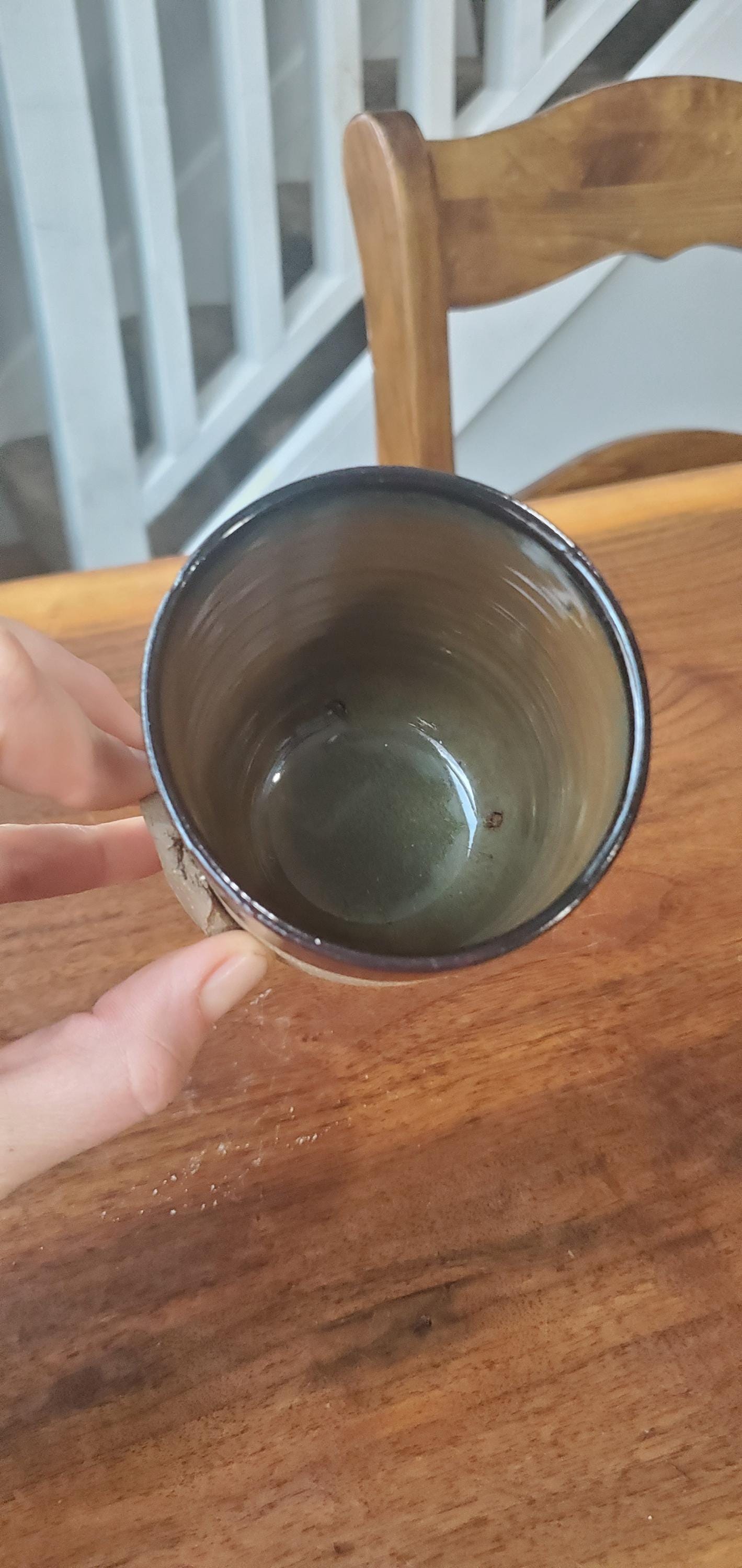 This teacup is handmade on a pottery wheel. The crimp hold is formed out of clay and attached while the clay is still wet. Made of beige stoneware clay, the outside feels and looks like real rock. It does not contain metal and has already been fired in the kiln to over 2,000 degrees fahrenheit. So, it is safe to put in the dishwasher and microwave!