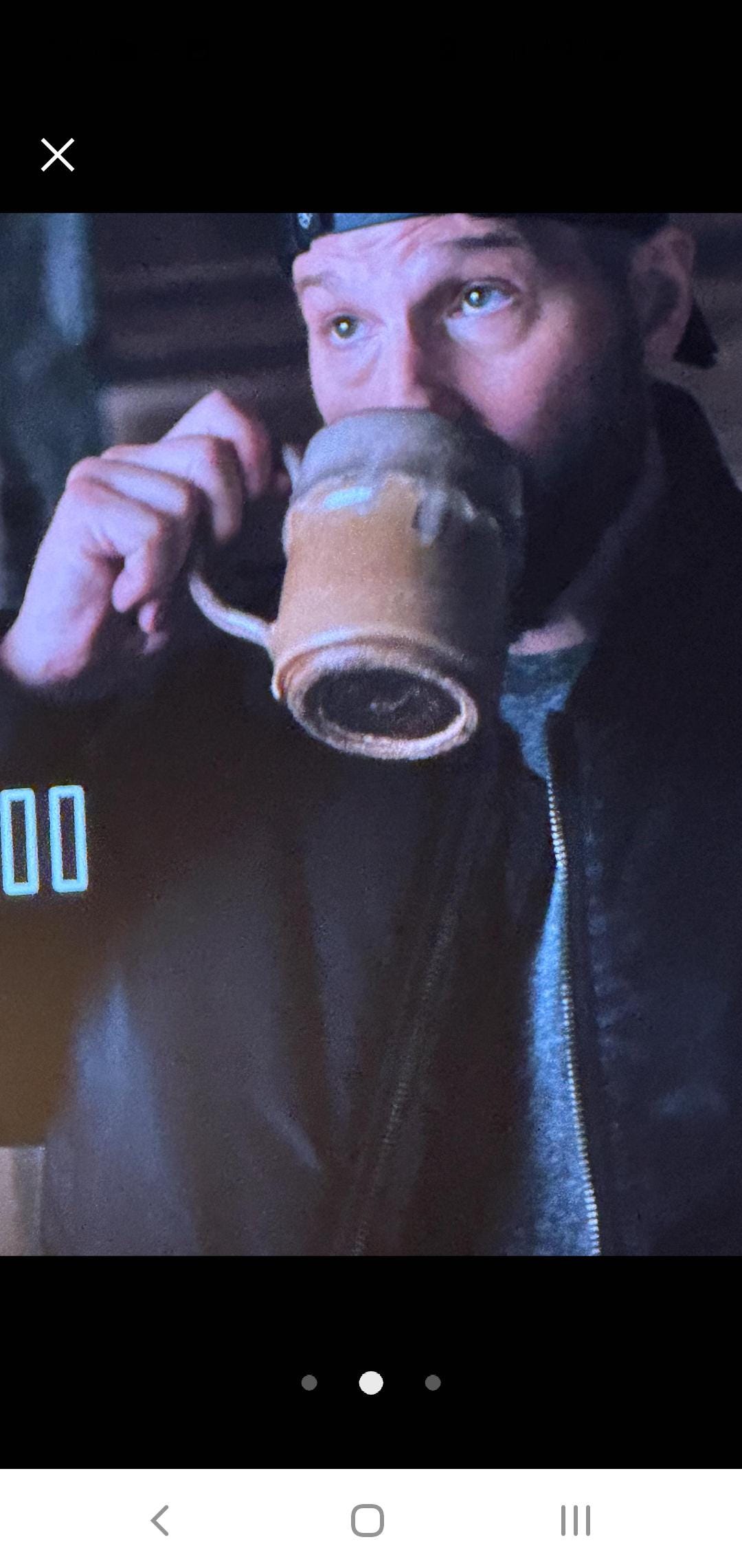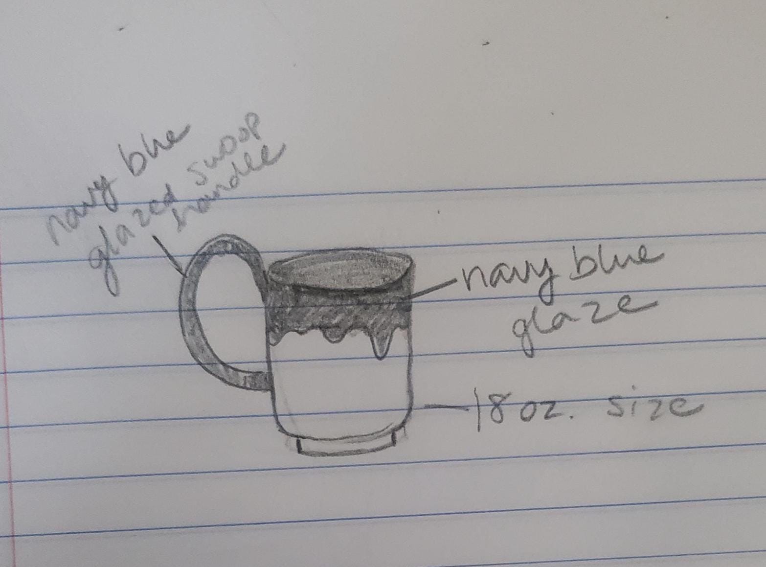 Large mug with large swoop handle. Navy blue drippy glaze. Holds about 18oz.