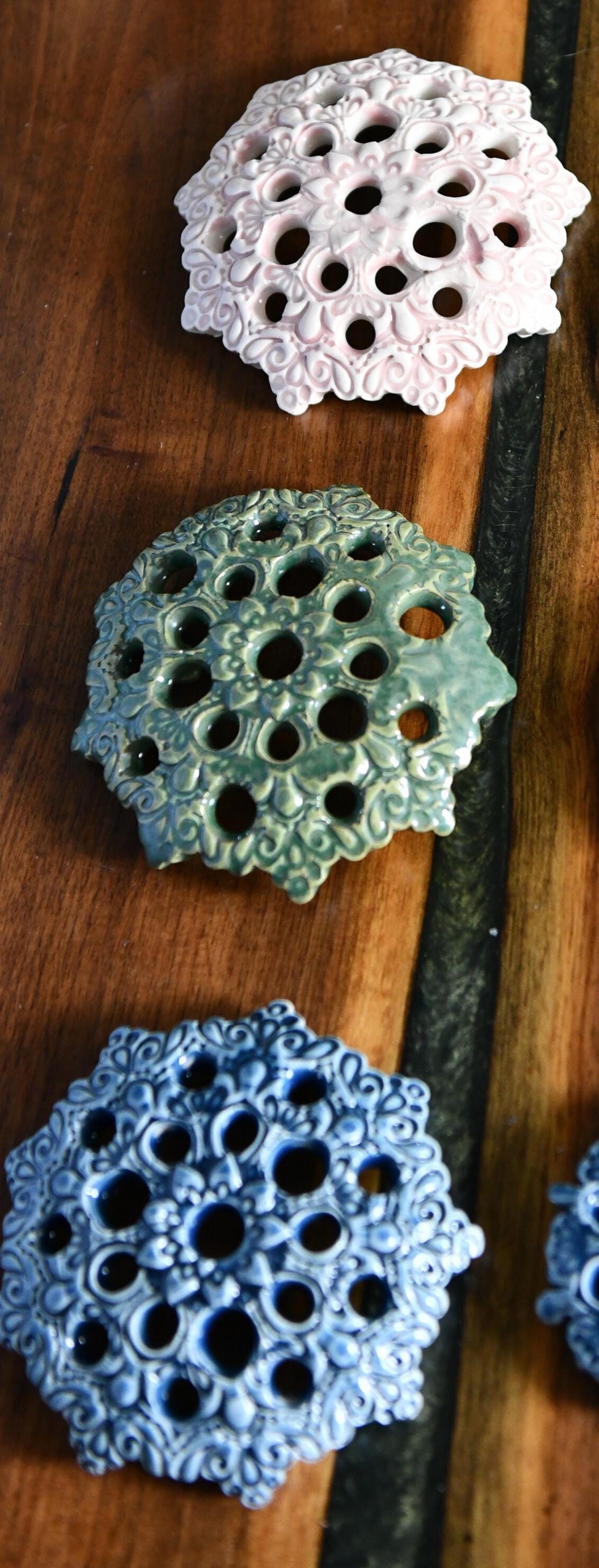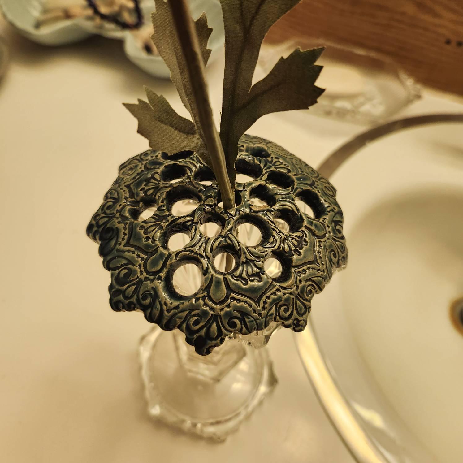 Your flower frog will be glazed with your choice of royal blue, green, or light pink. The glazes slide into the decorative pattern on the flower frogs, accentuating the mandala pattern.